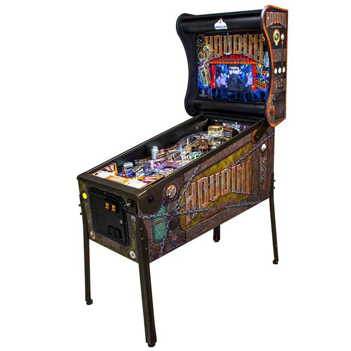 The Houdini Pinball Machine celebrates his life as it envelops the player with all things Houdini. Help Houdini perform his greatest tricks, be a part of his movies, participate in a seance and go on secret missions.
