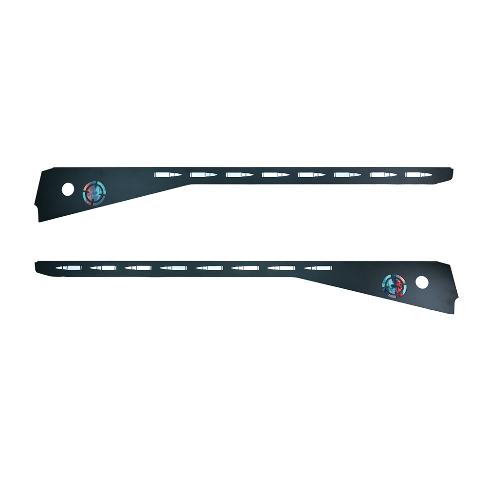 Enhance your game with the new modular Side Armor. This black side armor features laser cut bullet shaped openings with a silver foil backing and a zombie head in crosshairs. This side armor can be upgraded with the all new side armor lighting kit.